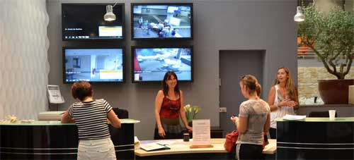 L'accueil à SKEMA Sophia Antipolis, avec chacun des 4 écrans branché sur un des autres campus de la grande école de commerce.