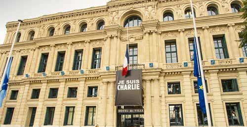 Lieu emblématique de la liberté de pensée, d’expression et de création, le Palais des festivals et des congrès de Cannes a tenu à afficher le soutien du monde libre aux valeurs républicaines et démocratiques face à la barbarie du terrorisme, ainsi que l'a souligné le maire, David Lisnard.